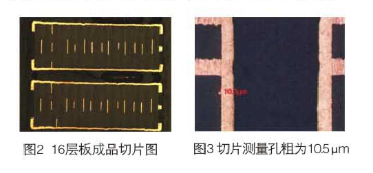 由于各層疊加導(dǎo)致板件和銅層超厚,對鉆頭磨損嚴重,容易折斷鉆刀,對于孔數(shù)、落速和轉(zhuǎn)速適當?shù)南抡{(diào)。精確測量板的漲縮,提供精確的系數(shù);層數(shù)≥14層、孔徑≤0.2mm或孔到線距離≤0.175mm,采用孔位精度≤0.025mm 的鉆機生產(chǎn);直徑φ4.0mm以上孔徑采用分步鉆孔,厚徑比12:1采用分步鉆,正反鉆孔方法生產(chǎn);控制鉆孔披鋒及孔粗,高層板盡量采用全新鉆刀或磨1鉆刀鉆孔,孔粗控制25um以內(nèi)。為改善高層厚銅板的鉆孔毛刺問題,經(jīng)批量驗證,使用高密度墊板,疊板數(shù)量為一塊,鉆頭磨次控制在3次以內(nèi),可有效改善鉆孔毛刺,如圖2、圖3所示。