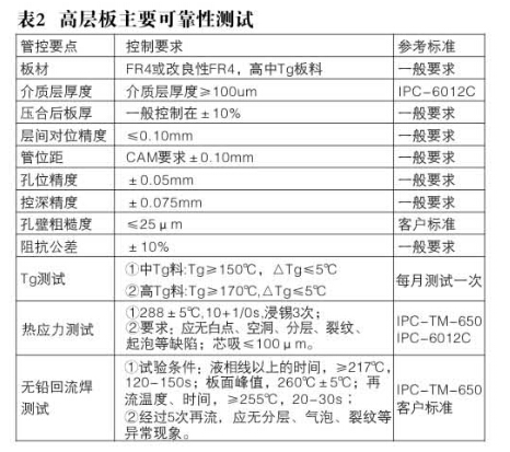 高層板一般為系統(tǒng)板,比常規(guī)多層板厚、更重、單元尺寸更大,相應(yīng)的熱容也較大,在焊接時,需要的熱量更多,所經(jīng)歷的焊接高溫時間要長。在217℃(錫銀銅焊料熔點)需50秒至90秒,同時高層板冷卻速度相對慢,因此過回流焊測試的時間延長,并結(jié)合IPC-6012C、 IPC-TM-650標準以及行業(yè)要求,對高層板的主要可靠性測試,如表2所述。