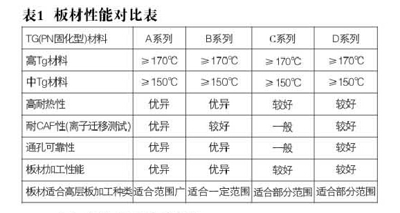 隨著電子元器件高性能化、多功能化的方向發(fā)展,同時帶來高頻、高速發(fā)展的信號傳輸,因此要求電子電路材料的介電常數(shù)和介電損耗比較低,以及低CTE、低吸水率和更好的高性能覆銅板材料,以滿足高層板的加工和可靠性要求。常用的板材供應(yīng)商主要有A系列、B系列、C系列、D系列,這四種內(nèi)層基板的主要特性對比,見表1。對于高層厚銅電路板選用高樹脂含量的半固化片,層間半固化片的流膠量足以將內(nèi)層圖形填充滿,絕緣介質(zhì)層太厚易出現(xiàn)成品板超厚,反之絕緣介質(zhì)層偏薄,則易造成介質(zhì)分層、高壓測試失效等品質(zhì)問題,因此對絕緣介質(zhì)材料的選擇極為重要。