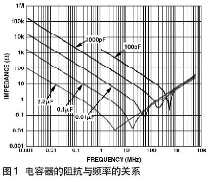 并聯(lián)不同的電容值的電容器有助于確保電源引腳在很寬的頻帶上只能看到很低的交流(AC)阻抗。這對于在運(yùn)算放大器電源抑制比(PSR)衰減頻率處尤其重要。該電容器有助于補(bǔ)償放大器降低的PSR。在許多十倍頻程范圍內(nèi)保持低阻抗的接地通路將有助于確保有害的噪聲不能進(jìn)入運(yùn)算放大器。圖1示出了采用多個并聯(lián)電容器的優(yōu)點。在低頻段,大的電容器提供低阻抗的接地通路。但是一旦頻率達(dá)到了它們自身的諧振頻率,電容器的容性就會減弱,并且逐漸呈現(xiàn)出感性。這就是為什么采用多個電容器是很重要的原因:當(dāng)一個電容器的頻率響應(yīng)開始下降時,另一個電容器的頻率響應(yīng)開始起作用,所以能在許多十倍頻程范圍內(nèi)保持很低的AC阻抗。