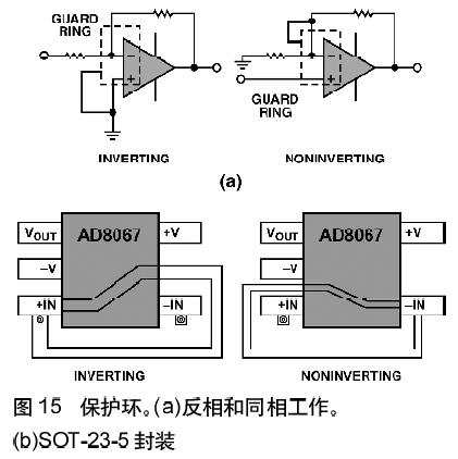 保護(hù)環(huán),或者說“隔離環(huán)”,是運(yùn)算放大器常用的另一種屏蔽方法,它用于防止寄生電流進(jìn)入敏感結(jié)點。其基本原理很簡單――用一條保護(hù)導(dǎo)線將敏感結(jié)點完全包圍起來,導(dǎo)線保持或者迫使它保持(低阻抗)與敏感結(jié)點相同的電勢,因此使吸收的寄生電流遠(yuǎn)離了敏感結(jié)點。圖15(a)示出了用于運(yùn)算放大器反相配置和同相配置中的保護(hù)環(huán)的原理圖。圖15(b)示出用于SOT-23-5封裝中兩種保護(hù)環(huán)的典型布線方法。