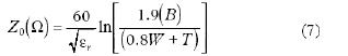 用于帶狀線的特征阻抗計算公式如公式(7)所示。