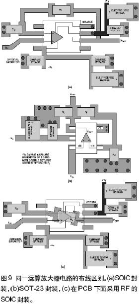 圖9示出了采用SOIC封裝(a)和SOT-23封裝(b)的運(yùn)算放大器之間的布線區(qū)別。每種封裝都有它自身的一些問題。重點看(a),仔細(xì)觀察反饋路徑就發(fā)現(xiàn)有多種方法連接反饋。重要的是保證印制線長度短。反饋路徑中的寄生電感會引起振鈴和過沖。在圖9(a)和9(b)中,環(huán)繞放大器連接反饋路徑。圖9(c)示出了另外一種方法――在SOIC封裝下面連接反饋路徑――這樣就減小了反饋路徑的長度。每種方法都有細(xì)微的差別。一種方法會導(dǎo)致印制線過長,會增大串聯(lián)電感。二種方法采用了通孔,會引起寄生電容和寄生電感。在給PCB布線時必須要考慮這些寄生效應(yīng)的影響及其隱含的問題。SOT-23布線差幾乎是理想的:反饋印制線長度短,而且很少利用通孔;負(fù)載和旁路電容從很短的路徑返回到相同的地線連接;正電源端的電容(圖9(b)中未示出)直接放在PCB背面的負(fù)電源電容的下面。