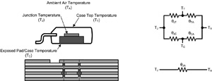 現(xiàn)在來快速了解一下如何進行不含散熱片的簡單PCB散熱設(shè)計,圖3示意了模塊及作為熱阻抗的PCB。與從結(jié)到裸片焊盤的熱阻抗相比,由于結(jié)與外封裝頂部間的熱阻抗相對較高,因此在一次估計從結(jié)到周圍空氣的熱阻(θJT)時,我們可以忽略θJA散熱路徑。