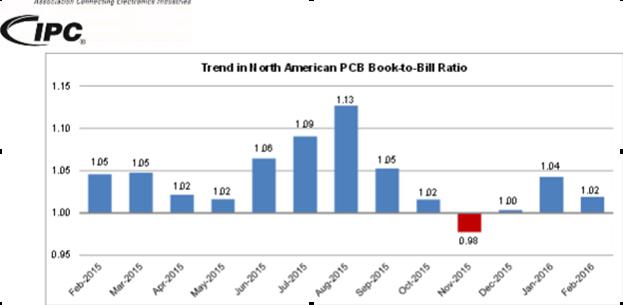 2016年3月31日,IPC發(fā)布《2016年2月份北美地區(qū)PCB行業(yè)調(diào)研統(tǒng)計報告》。報告顯示,2月份PCB銷量反彈,強于訂單量,訂單出貨比由此回落至1.02。 2016年2月份北美PCB總出貨量,與20