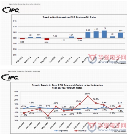 PCB總訂單量,與2014年2月份相比,同比增長5.1%,推動年初至今的訂單量增長0.9%;與上個月相比,環(huán)比下降了0.7%。2015年2月份北美地區(qū)PCB行業(yè)訂單出貨比,高達(dá)1.05。