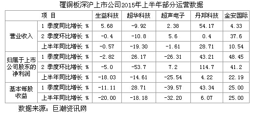 我覆銅板制造企業(yè)或包含有覆銅板制造的企業(yè),在深滬上市的共有5家公司。根據(jù)這些公司公布的業(yè)績(jī)報(bào)告,整理計(jì)算的各公司營(yíng)業(yè)收入、歸屬于上市公司股東的凈利潤(rùn)和基本每股收益3項(xiàng)指標(biāo)的增長(zhǎng)情況,如下表。