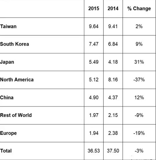 際半導(dǎo)體設(shè)備與材料協(xié)會(huì)-SEMI3月14日公布:2015年全球半導(dǎo)體制造設(shè)備總銷售為365.3億美元,較上一年減少了3%。2015年總設(shè)備訂單比2014年低5%。