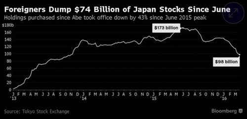 出于對安倍經(jīng)濟學以及日本經(jīng)濟前景的悲觀態(tài)度,彭博數(shù)據(jù)顯示,今年來交易員撤走了460億美元的資金,投資者已經(jīng)連續(xù)十三周拋售日本股票,創(chuàng)1998年以來長連跌紀錄。東證指數(shù)下跌17%,這一表現(xiàn)之差僅次于意大利。