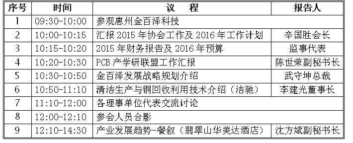根據(jù)協(xié)會章程規(guī)定,為加強(qiáng)各理事單位之間的交流,推動協(xié)會工作的發(fā)展,現(xiàn)定于2016年5月6日上午在惠州市金百澤電路科技有限公司召開GPCA一屆四次理事會暨SPCA二屆五次理事會,參觀金百澤、匯報(bào)2015工作總結(jié)及2016年度工作計(jì)劃,現(xiàn)將會議內(nèi)容及相關(guān)事項(xiàng)通知如下: