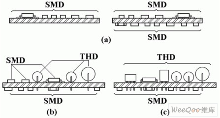 在印制板的A面上只安裝通孔插裝元器件,而小型的smt元器件貼裝在印制板的B面上,見圖(c)。