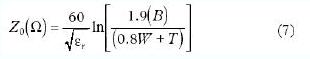 用于帶狀線的特征阻抗計(jì)算公式如公式(7)所示。