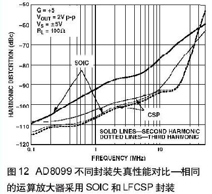 這種引腳排列還有一個(gè)好處就是降低了二次諧波失真。傳統(tǒng)運(yùn)算放大器的引腳配置中引起二次諧波失真的一個(gè)原因是同相輸入和負(fù)電源引腳之間的耦合作用。LFCSP封裝的低失真引腳排列消除了這種耦合所以極大地降低了二次諧波失真;在有些情況下多可降低14 dB。圖12示出了AD80992 采用SOIC封裝和LFCSP封裝失真性能的差別。