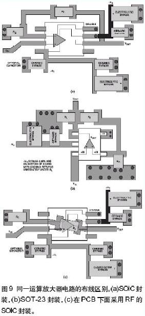 圖9示出了采用SOIC封裝(a)和SOT-23封裝(b)的運(yùn)算放大器之間的布線區(qū)別。每種封裝都有它自身的一些問(wèn)題。重點(diǎn)看(a),仔細(xì)觀察反饋路徑就發(fā)現(xiàn)有多種方法連接反饋。重要的是保證印制線長(zhǎng)度短。反饋路徑中的寄生電感會(huì)引起振鈴和過(guò)沖。在圖9(a)和9(b)中,環(huán)繞放大器連接反饋路徑。圖9(c)示出了另外一種方法——在SOIC封裝下面連接反饋路徑——這樣就減小了反饋路徑的長(zhǎng)度。每種方法都有細(xì)微的差別。一種方法會(huì)導(dǎo)致印制線過(guò)長(zhǎng),會(huì)增大串聯(lián)電感。二種方法采用了通孔,會(huì)引起寄生電容和寄生電感。在給PCB布線時(shí)必須要考慮這些寄生效應(yīng)的影響及其隱含的問(wèn)題。SOT-23布線差幾乎是理想的:反饋印制線長(zhǎng)度短,而且很少利用通孔;負(fù)載和旁路電容從很短的路徑返回到相同的地線連接;正電源端的電容(圖9(b)中未示出)直接放在PCB背面的負(fù)電源電容的下面。