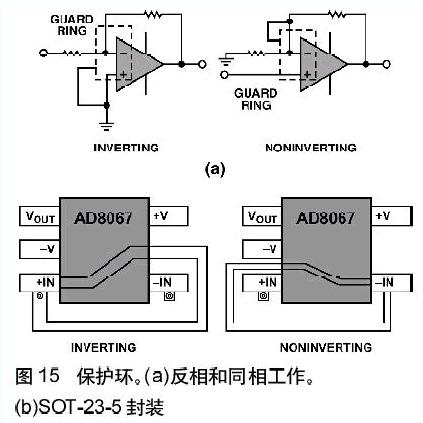 保護(hù)環(huán),或者說(shuō)“隔離環(huán)”,是運(yùn)算放大器常用的另一種屏蔽方法,它用于防止寄生電流進(jìn)入敏感結(jié)點(diǎn)。其基本原理很簡(jiǎn)單——用一條保護(hù)導(dǎo)線將敏感結(jié)點(diǎn)完全包圍起來(lái),導(dǎo)線保持或者迫使它保持(低阻抗)與敏感結(jié)點(diǎn)相同的電勢(shì),因此使吸收的寄生電流遠(yuǎn)離了敏感結(jié)點(diǎn)。圖15(a)示出了用于運(yùn)算放大器反相配置和同相配置中的保護(hù)環(huán)的原理圖。圖15(b)示出用于SOT-23-5封裝中兩種保護(hù)環(huán)的典型布線方法。