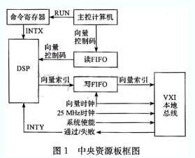 目標(biāo)板是一個中央資源板子系統(tǒng),其結(jié)構(gòu)如圖1所示。主要作用是為數(shù)字通道子系統(tǒng)提供精確的時序信息,為數(shù)字通道板之間提供定時和控制信號,分析處理數(shù)字通道子系統(tǒng)和探筆子系統(tǒng)返回的數(shù)據(jù)。該電路板上有4個邊界掃描器件:EPLD(EPM7256AETC144)、FPGA(EP1S25F780)、Flash EPROM(EPC8)和DSP(TMS320C6203B)。