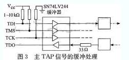 為保證信號的完整性,本文對來自測試裝置的主TAP控制信號進(jìn)行了緩沖處理,同時用上拉電阻將TDI、TMS信號拉至邏輯1狀態(tài),將TCK下拉接地。另外,在后一個器件的TDO和被測板的TDO端口之間放置一個20 Ω的電阻以衰減反射。緩沖器類型的選用要參考電路板上器件的電平類型。如圖3所示,被測板上邊界掃描器件工作電壓為3.3 V,本文選用的緩沖器SN74LV244的工作電壓為2.7 V~5.5 V,可以滿足需要。