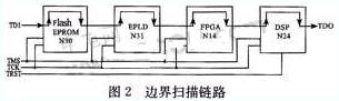 在此目標(biāo)板上,我們將Flash EPROM(N30)、DSP(N31)、EPLD(N14)和FPGA(N24)依次連接起來,成為一個完整的掃描鏈路。TAP控制信號(TCK、TMS、TRST*)并聯(lián),前一器件的TDO和后一器件的TDI依次連接成鏈。其中只有DSP有TRST*信號。對于TRST*信號,因?yàn)樗堑碗娖接行?,若在器件?nèi)部或者電路板上已經(jīng)上拉,則在測試時可以不加以控制。而在該目標(biāo)板的DSP內(nèi)部此引腳處于下拉狀態(tài),為使其進(jìn)人邊界掃描狀態(tài),必須外加激勵信號,因此本文把它單獨(dú)引出來。如圖2所示。