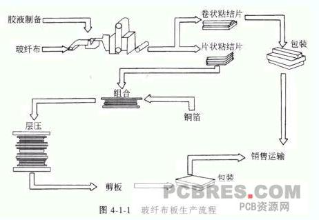 在覆銅板的生產(chǎn)流程中,一般包括:膠液制備、浸膠、粘結(jié)片貯存、組合、層壓、成品檢驗(yàn)(含外部和內(nèi)部質(zhì)量檢驗(yàn))、剪切包裝等工序。具體見圖4-1-1 (以玻纖布板為例)。