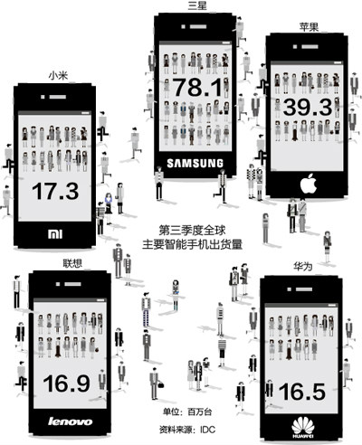中手機(jī)廠商正在集體向全球三的位置發(fā)起沖擊。 10月30日,IDC發(fā)布研究報(bào)告稱,三季度全球智能手機(jī)出貨量為3.276億部,較去年同期的2.617億部增長(zhǎng)25.2%,其中三星和蘋果位居前兩位,緊隨其后的是小米、聯(lián)想和LG。而在今年上半年,三名還是華為,LG和聯(lián)想分列四、五。