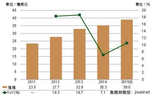 雖自2011年以來(lái),全球智慧型手機(jī)出貨量年成長(zhǎng)率即呈現(xiàn)逐年下滑態(tài)勢(shì),但2015年預(yù)估仍能維持2位數(shù)年成長(zhǎng)幅度,加上來(lái)自大陸IC內(nèi)需市場(chǎng)規(guī)模亦持續(xù)成長(zhǎng),使得同期大陸IC設(shè)計(jì)業(yè)產(chǎn)值仍將能維持20%以上的成長(zhǎng)動(dòng)能。在大陸IC設(shè)計(jì)產(chǎn)業(yè)強(qiáng)勁成長(zhǎng)帶動(dòng)下,DIGITIMESResearch預(yù)估,2015年大陸晶圓代工產(chǎn)業(yè)產(chǎn)值將達(dá)39億美元,較2014年成長(zhǎng)10.5%。