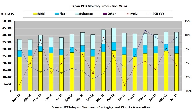 來源:日本2015年6月PCB總產(chǎn)值: 44,152 百萬日元