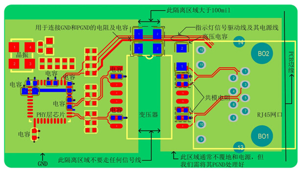 d) 網(wǎng)口變壓器接口側(cè)的共模電阻和高壓電容靠近中心抽頭放置,走線(xiàn)短而粗(≥15mil);
