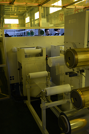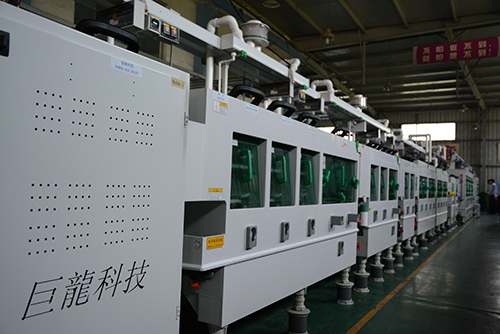 在閆董的帶領(lǐng)陪同下,GPCA/SPCA一行參觀了巨龍自主研發(fā)制造的RTR/DES生產(chǎn)線。據(jù)介紹,RTR/DES生產(chǎn)線的大特點在于卷對卷、水平雙工位作業(yè),該DES線的過板能力薄0.036mm,板寬度為250mm,同時能生產(chǎn)兩種不同規(guī)格的產(chǎn)品,大大提升了生產(chǎn)效率;同時,此DES線還配置了真空蝕刻工藝,有效防止“水池效應(yīng)”、提高蝕刻均勻性,目前在片對片實驗中極差值已達到了94%以上,量產(chǎn)可達到40um/40um。該DES線不僅節(jié)省了勞動成本、提高了整體的生產(chǎn)效率,還有效保證軟板的品質(zhì),使軟板生產(chǎn)技術(shù)更上一個臺階。