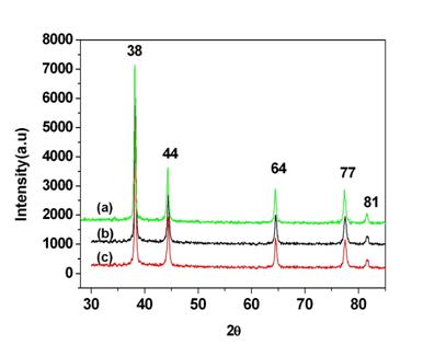 圖1 制備的納米銀XRD分析:(a)抗壞血酸還原,(b)硼氫化鉀還原,(c)硼氫化鉀加PAAS分散劑